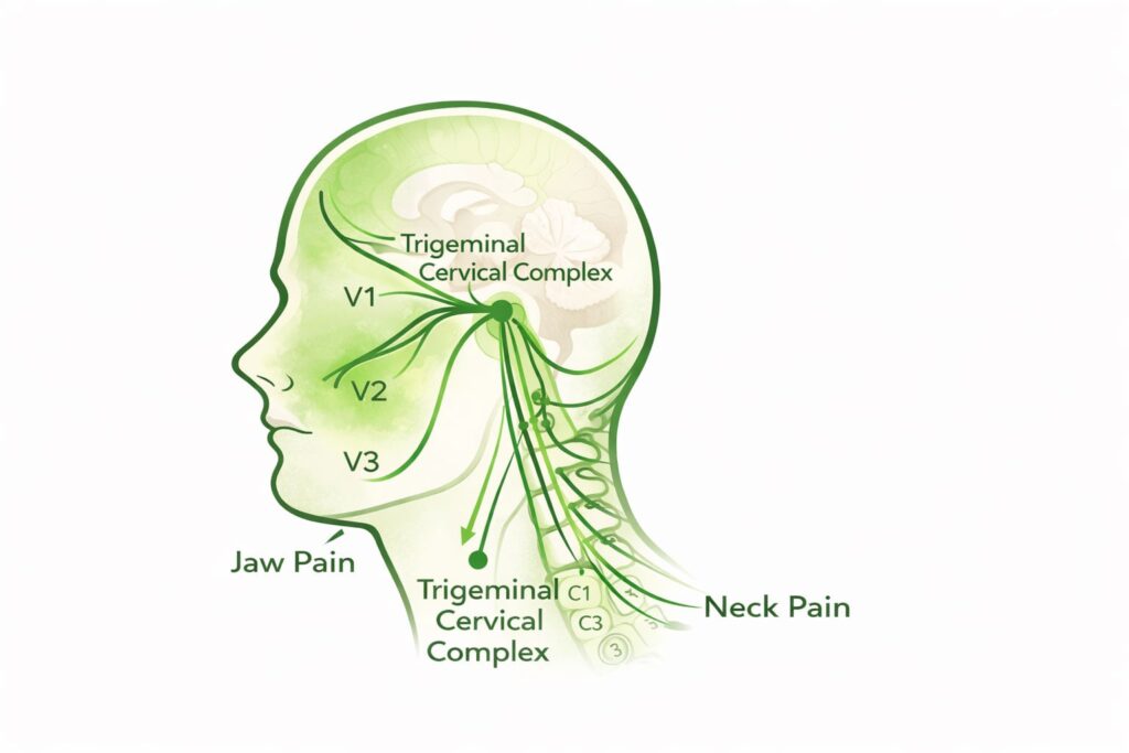 This is partly due to shared nerve pathways between the jaw and upper neck, sometimes referred to as the trigeminal cervical complex. Because these areas are closely connected, pain can sometimes be felt away from its original source. This is known as referred pain.